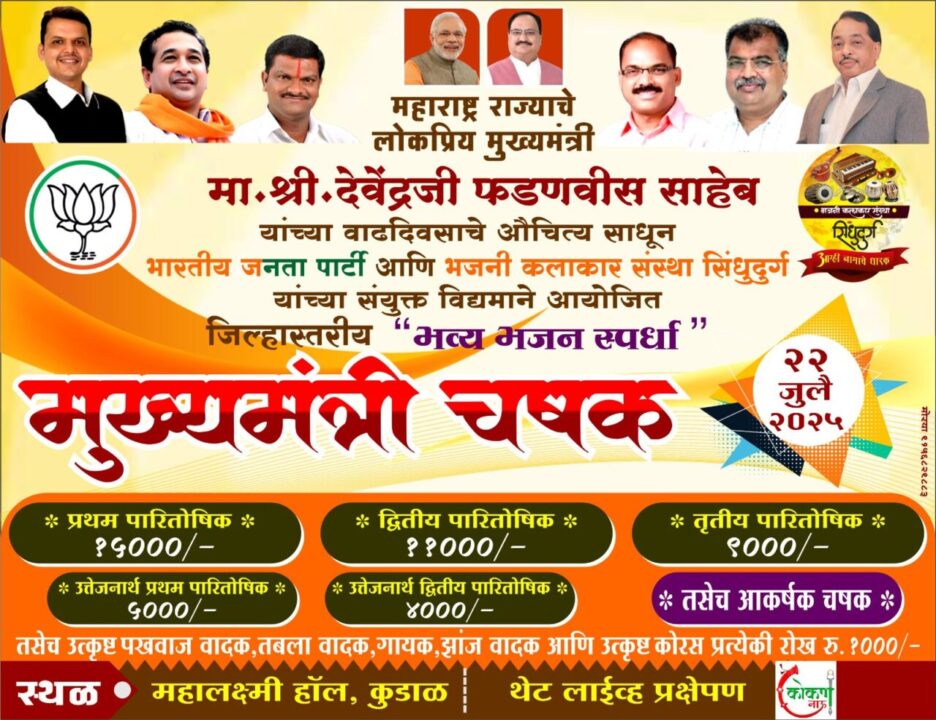 महाराष्ट्राचे मुख्यमंत्री देवेंद्र फडणवीस यांच्या वाढदिवसानिमित्त येत्या 22 जुलै रोजी कुडाळ येथे मुख्यमंत्री चषक भव्य जिल्हास्तरीय भजन स्पर्धा आयोजित करण्यात आली असून या सोहळ्यामध्ये जिल्ह्यातील सर्व भजन प्रेमींनी सहभागी व्हावे असे आवाहन भजनी कलाकार संस्था सिंधुदुर्ग चे अध्यक्ष बुवा श्री संतोष कानडे यांनी केले आहे.