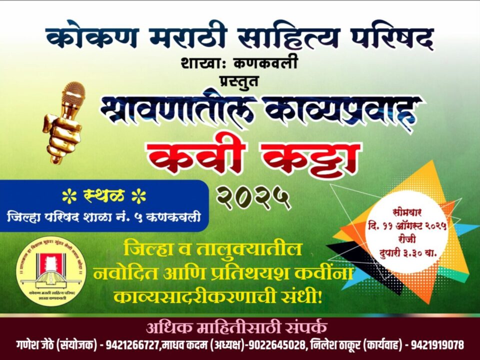कोकण मराठी साहित्य परिषदेच्या कणकवली शाखेतर्फे “श्रावणातील काव्यप्रवाह… कवी कट्टा” या काव्य संमेलनाचे आयोजन कणकवली शाळा क्र. ५ (शिवाजी नगर) येथे करण्यात आले आहे. या संमेलनाचे प्रमुख मार्गदर्शक म्हणून, ज्यांची लोकप्रियता दिल्लीपासून कन्याकुमारीपर्यंत पसरलेली आहे असे ख्यातनाम मराठी व कोंकणी कवी, तसेच कोकण मराठी साहित्य परिषदेचे जिल्हा संघटक श्री. रूजारिओ पिंटो उपस्थित राहणार आहेत.