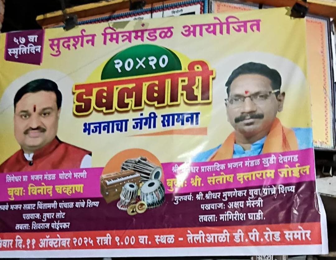 सर्वपित्री अमावस्या दिवशी गडनदीपुलावर झालेल्या अपघाती दुर्घटनेत मृत्युमुखी पडेलल्यांना आदरांजली वाहण्यासाठी सुदर्शन मित्रमंडळातर्फे शनिवार ११ ऑक्टोबर रोजी रात्री ९ वा. तेलीआळी येथील डी.पी.रोडसमोर डबलबारीचा सामना आयोजित करण्यात आला आहे. लिंगेश्वर प्रा. भजन मंडळ घोटगे-भरणी, कुडाळचे बुवा विनोद चव्हाण विरुद्ध श्री भुतेश्वर प्रा. भजन मंडळ, खुडी देवगडचे बुवा संतोष जोईल यांच्यात होणार आहे. चव्हाण यांना तुषार लोट, शिवराज पोईपकर, जोईल यांना अक्षय मेस्त्री, मांगिरीश घाडी संगीतसाथ देणार आहेत. तरी भजनप्रेमींनी डबलबारीचा सामना पाहण्यासाठी उपस्थित रहावे, असे आवाहन सुदर्शन मित्रमंडळातर्फे करण्यात आले आहे.