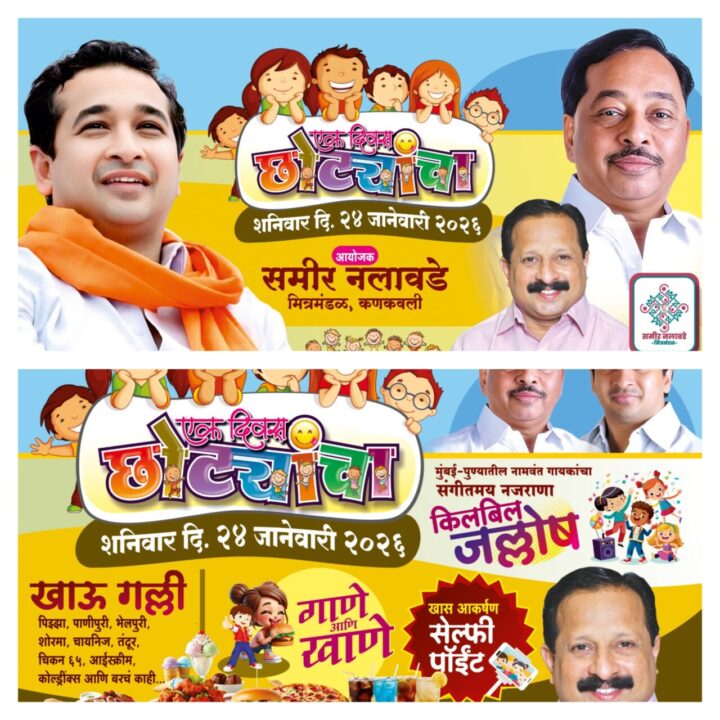 समीर नलावडे मित्र मंडळाच्या वतीने एक दिवस छोट्यांसाठी, खाऊगल्ली व किलबिल जल्लोष या लक्षवेधी उपक्रमाचे आयोजन उद्या 24 जानेवारी रोजी चौंडेश्वरी मंदिरानजीक गणपती साना येथे करण्यात आले आहे. जिल्ह्याचे पालकमंत्री नितेश राणे यांच्या हस्ते सायंकाळी 5.30 वाजता या उपक्रमाचा शुभारंभ होणार आहे. खाणे व गाणे ही या कार्यक्रमाची टॅग लाईन असणार आहे. मुंबईतील नामवंत गायकांचा संगीताचा नजराना किलबिल जल्लोष च्या माध्यमातून सादर केला जाणार आहे. तसेच लहान मुलांना खाऊ साठी एक मोफत कुपन दिले जाणार आहे. लहान मुलांना आकर्षण असणारे वेगवेगळ्या प्रकारचे कार्टून या ठिकाणी असणार आहेत. लहान मुलांना मज्जा मस्ती करता यावी , थोडा विरंगुळा मिळावा या उद्देशाने खाऊ गल्ली कार्यक्रमाचे आयोजन करण्यात आले आहे. या वेळी विविध खाद्य पदार्थांचे स्टॉल मोफत लावण्यासाठी जागा उपलब्ध करून देण्यात येणार आहे. झोपाळे, पाळणी, अनेक खेळणी देखील या ठिकाणी असणार आहेत. स्थानिकांना, बचतगटाना स्टॉल साठी प्राधान्य देण्यात येणार देणार आहे. प्रथम येणाऱ्यास प्राधान्य असणार आहे. या खाऊ गल्ली मध्ये पिझा, पाणीपुररी, आईस्क्रीम, कोल्ड्रिंक्स, शोरमा, चायनीज, असे अनेक स्टॉल असणार आहेत. या कार्यक्रमाचा लाभ घ्यावा असे आवाहन श्री. नलावडे यांनी केले आहे.